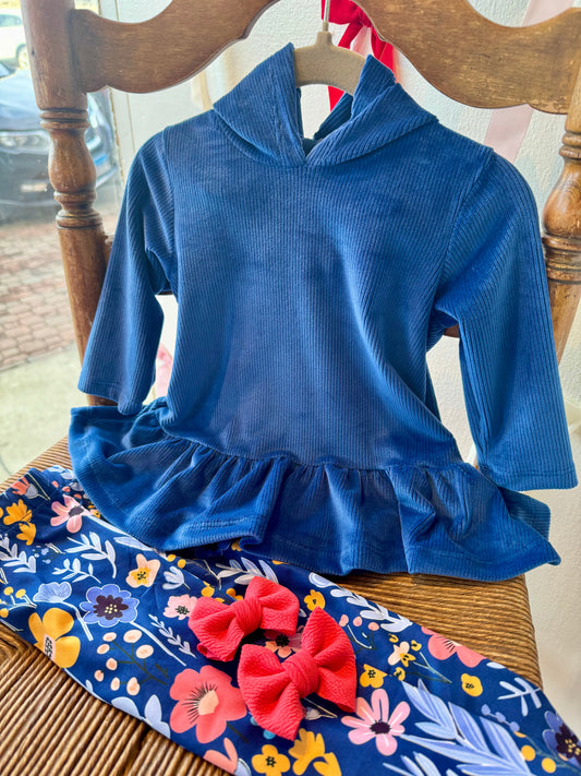 Navy Velour Ruffle-Hem Hooded Tunic & Floral Leggings