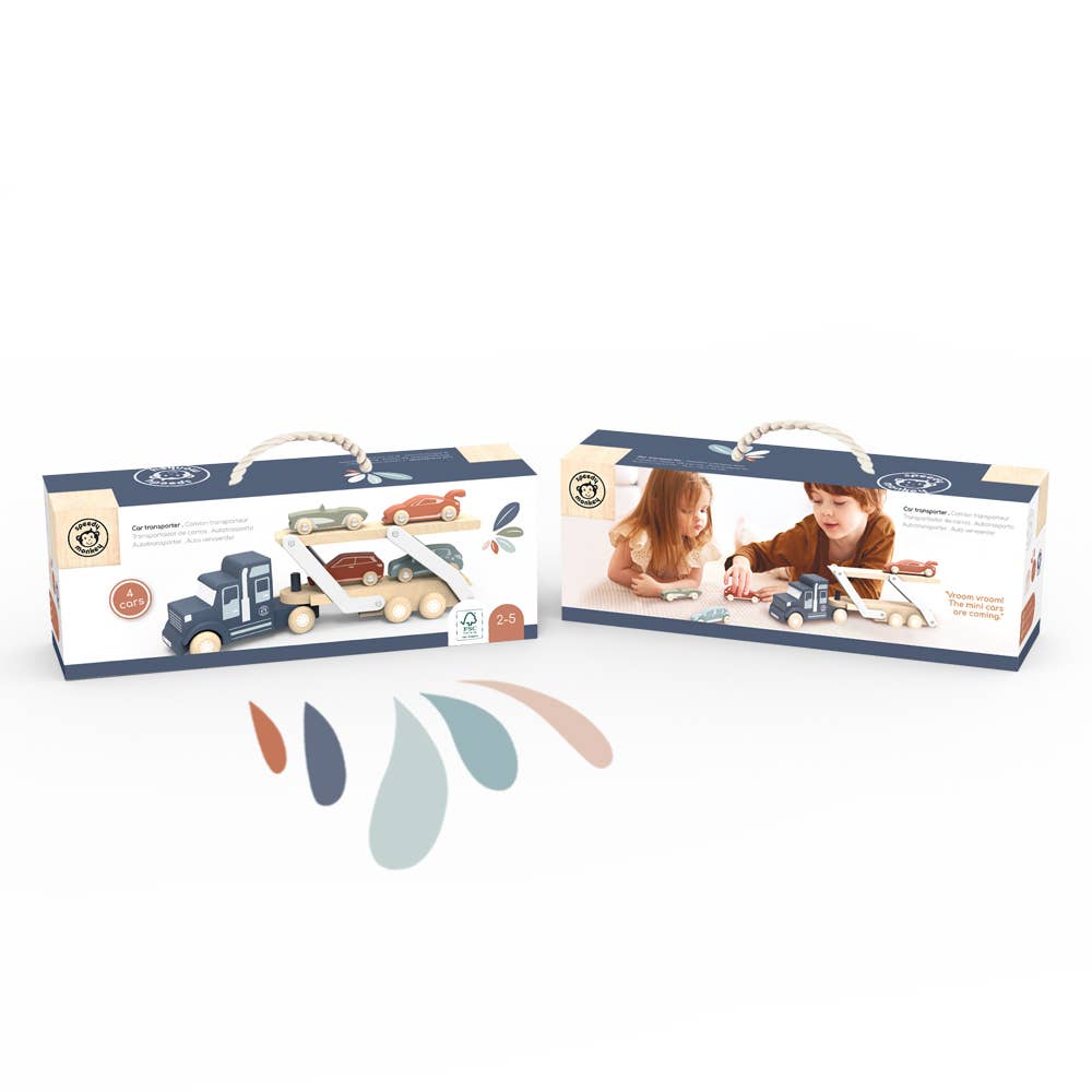 This wooden car transporter truck toy has a double-deck trailer. It easily converts for loading and unloading. Four colorful assorted models of solid wooden cars are included with the trailer. Slots are designed on the trailer to avoid cars from falling. Your little one can safely race along an imaginary road. While exciting and fun, this toy helps to develop fine motor skills, manual dexterity and creative play.
