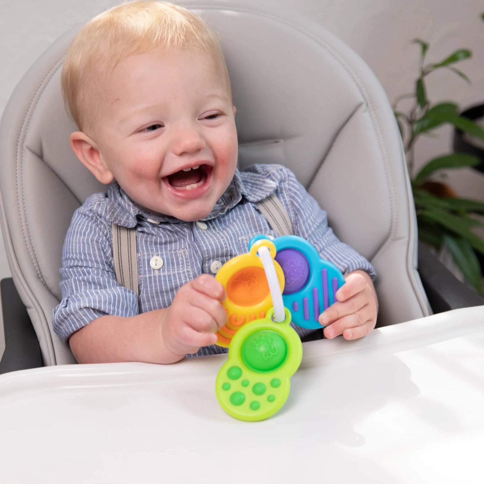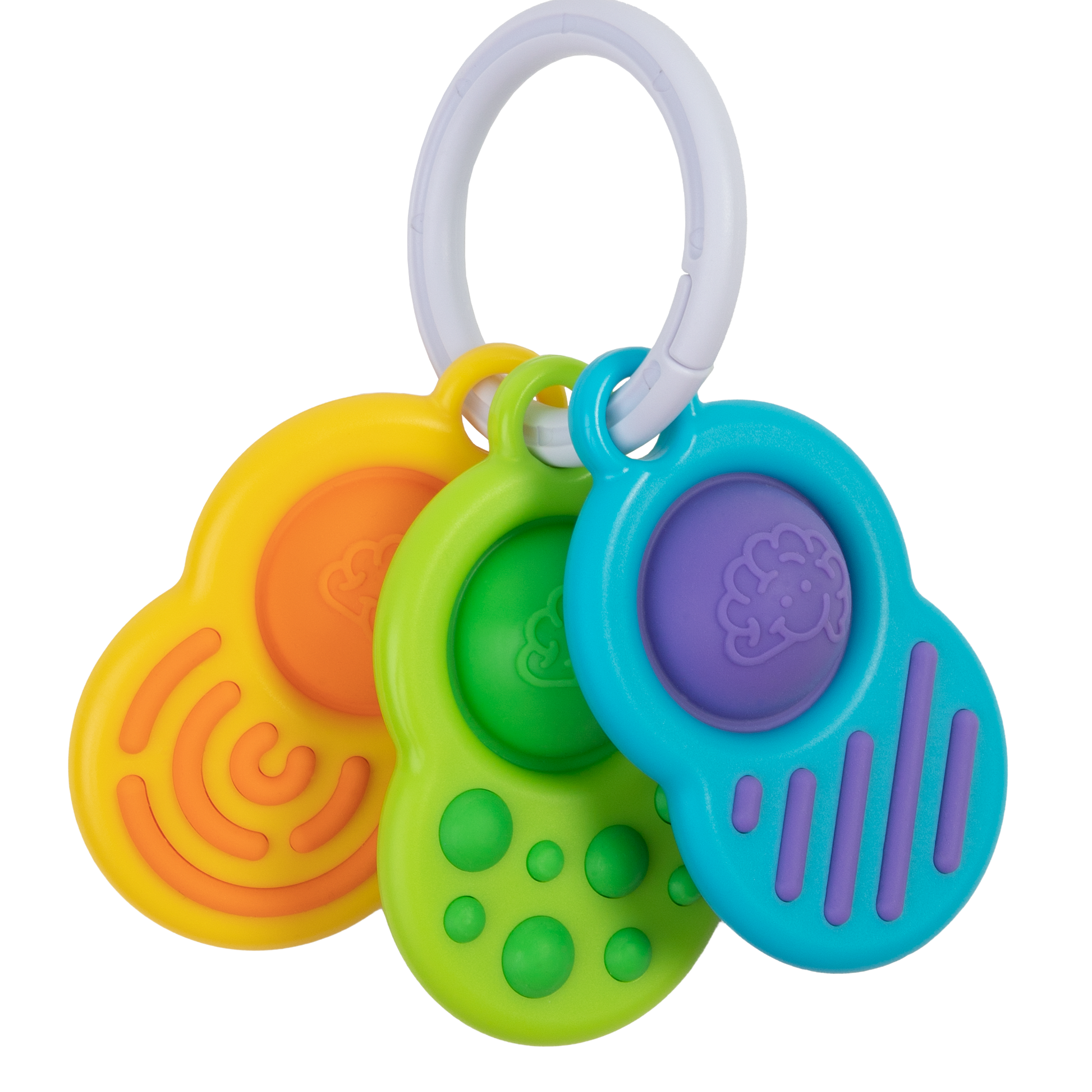 Each Clutch features a dimpl bubble on one end and squishy silicone textures on the other. There's green with bumps, yellow with circles, blue with lines... so much for the fingers to explore! Perfectly chunky and click-clacking on a big clip-n-go ring, Dimpl Clutch is a must-have for all your adventures. Set of 3 dimpl sensory toys on a large key ring that encourages sensory learning, fine motor skills Each features a dimpl bubble, unique textures to explore Chunky size is perfect for small hands