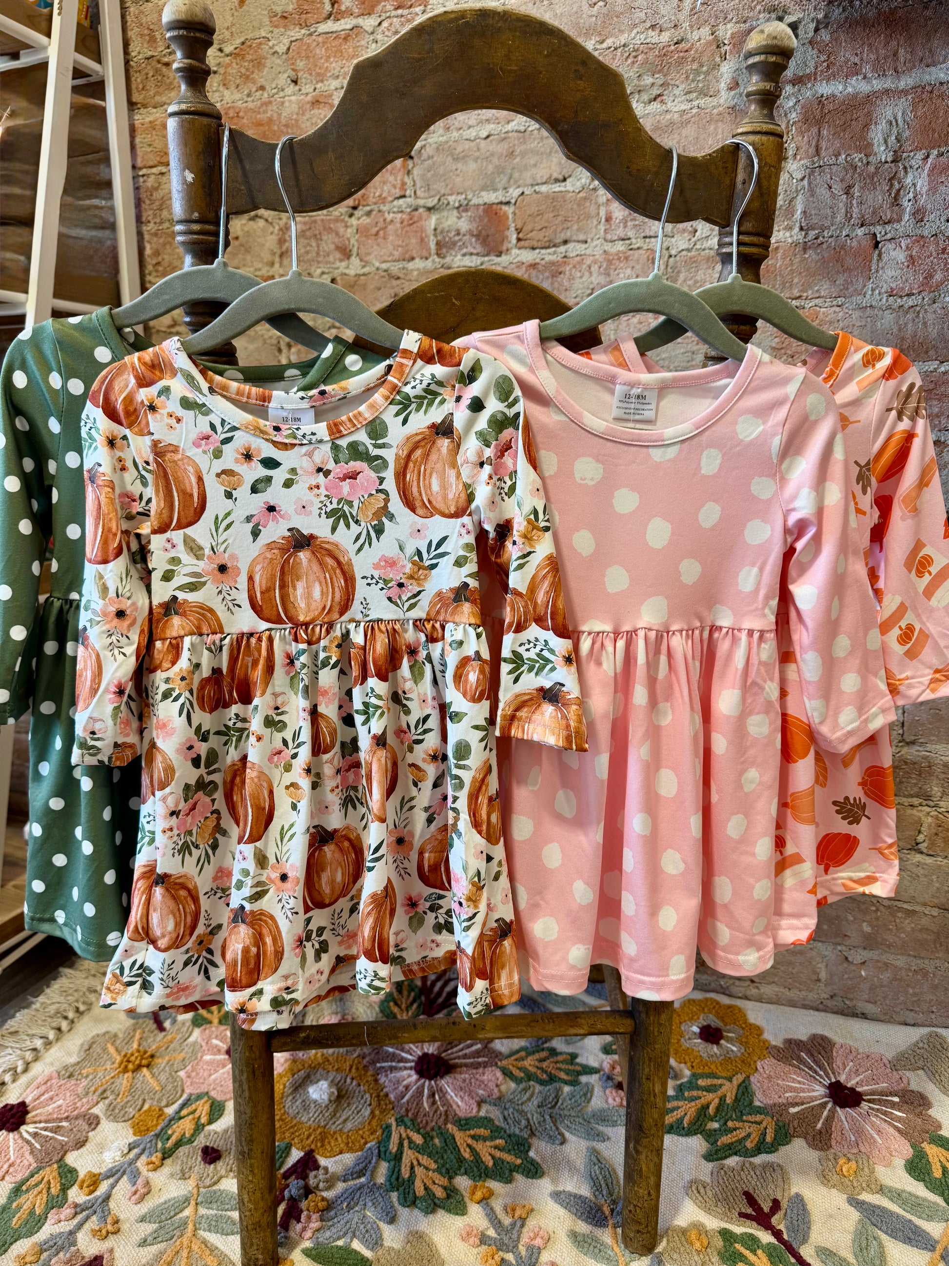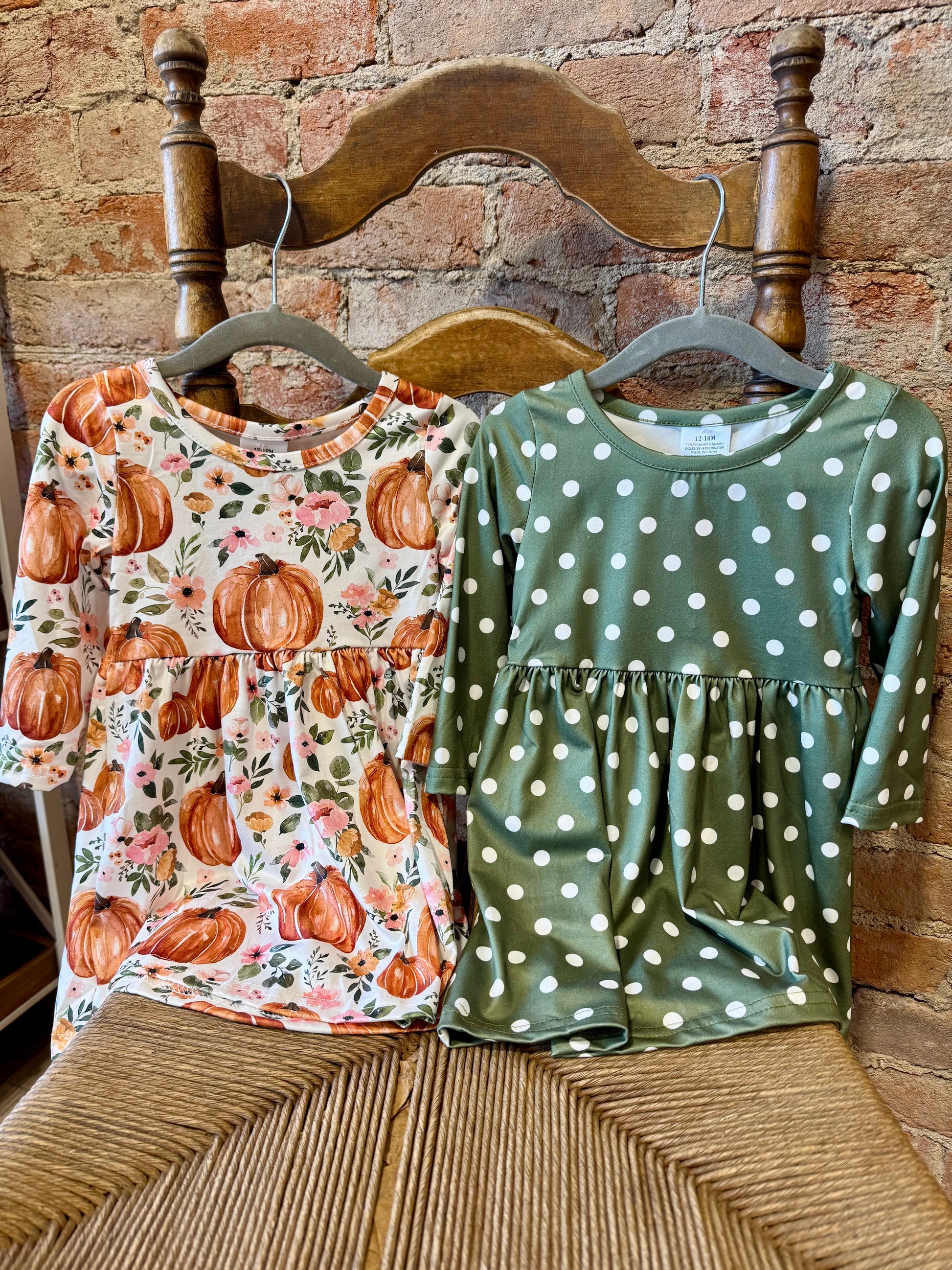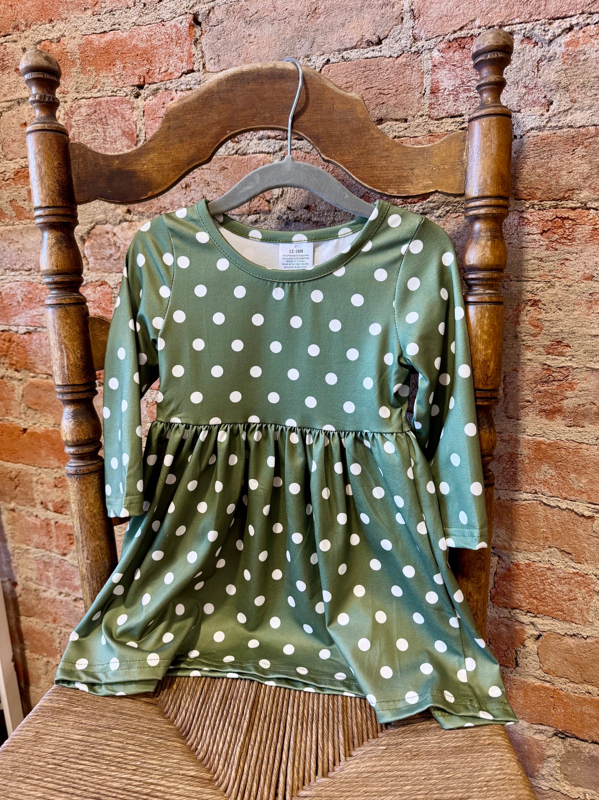 This Green Polka Dot dress will be perfect for all of your activities from fall into the Christmas season. The pleated detail at the waist makes it the PERFECT twirl dress!