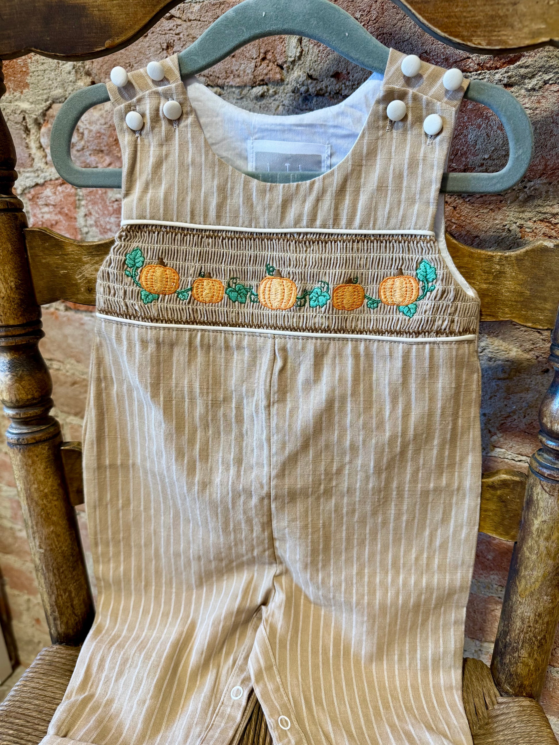 These Light Brown Pinstripe Pumpkin Smocked Overalls by Lil Cactus are a charming choice for your little boy this Fall season. Detailed with smocking at the chest with adorable pumpkin embroidery. Buttons at the shoulder ensure adjustable sizing, while snap enclosures make diaper changes quick and easy, and cuffed pant legs for that extra little something! Perfect for Thanksgiving gatherings, family photos, and visits to the pumpkin patch. These overalls will keep your little turkey cozy and stylish all season long.